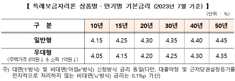 이에 우대형은 연 4.05(10년)∼4.35%(50년), 일반형은 연 4.15(10년)∼4.45%(50년)의 금리가 적용된다.