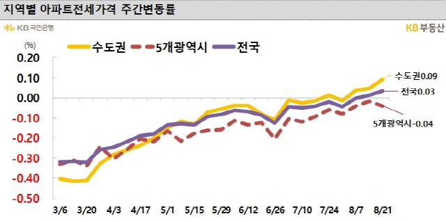 KB부동산은 지난 21일 발표한 ‘주간KB주택시장동향’ 자료에 따르면 전국 아파트 전세가격은 0.02% 상승세를 기록했다고 밝혔다.