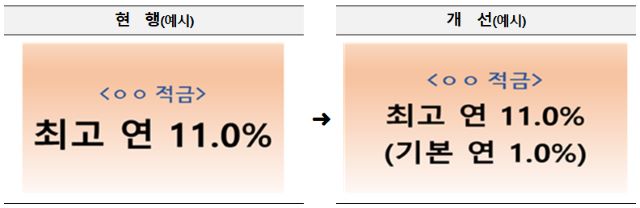 이와 함께 만기시 수취 이자에 대한 충분한 정보를 제공해야 한다. 현재 예적금 상품은 상품설명서 등을 통해 약정이율과 이자산식만 기재하고 있다. 특히 적금의 경우 월 납입금액 등에 따라 최종불입원금 대비 이율이 다르므로 소비자 오인가능성을 최소화할 필요가 있다. 따라서 광고시 금융상품판매업자는 납입금액·계약기간·적용금리 등 상품구조에 따라 수취 이자에 대한 정보를 자율적으로 충분히 제공해야 한다.