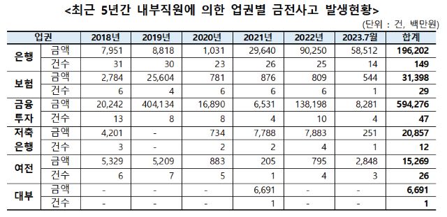 최근 5년간 내부직원에 의해 발생한 업권별 금융사고 금액을 살펴보면 금융투자가 5943억원으로 가장 많았고 ▲은행 1962억원 ▲보험 314억원 ▲저축은행 209억원 ▲여신전문금융 153억원 ▲대부 67억원 순이며 사고 건수는 ▲은행 149건 ▲금융투자 47건 ▲보험 29건 ▲여신전문금융 26건 ▲저축은행 12건 ▲대부 1건 순이다.