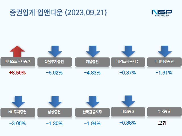(서울=NSP통신) 송희진 기자 = 21일 코스피(-1.75%)와 코스닥(-2.50%)은 모두 하락했다. 이 가운데 증권주는 전거래일 대비 1.47% 하락했다. 증권주는 38종목 가운데 2종목이 상승, 35종목이 하락했다. 보합세는 1종목이다.