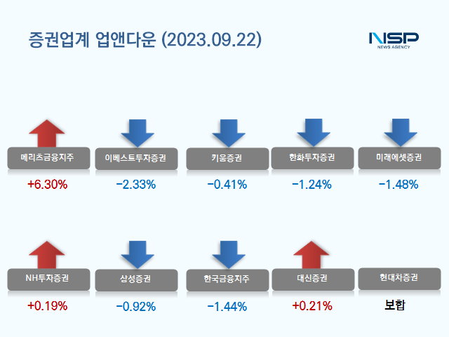 (서울=NSP통신) 송희진 기자 = 22일 코스피(-0.27%)와 코스닥(-0.39%)은 모두 하락했다. 이 가운데 증권주는 전거래일 대비 1.57% 상승했다. 증권주는 38종목 가운데 8종목이 상승, 26종목이 하락했다. 보합세는 4종목이다.