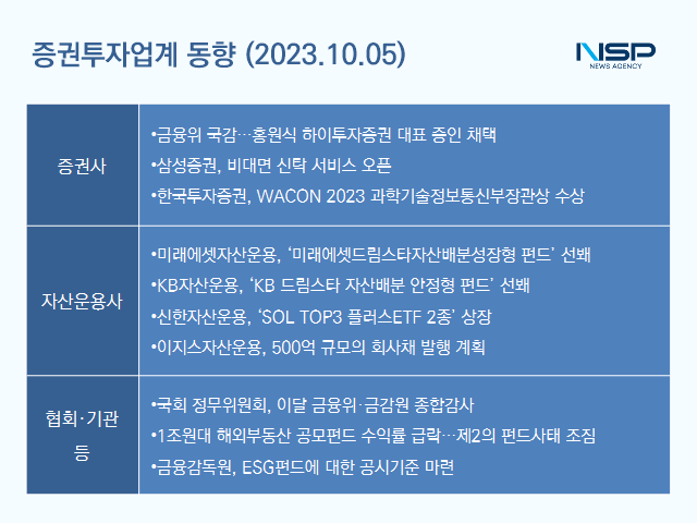 (서울=NSP통신) 송희진 기자 = 금융위원회 소관 국정감사 1차 출석자 명단이 공개됐다. 증권사 최고경영자 중 유일하게 하이투자증권 대표가 증인으로 채택됐다. 국회 정무위원회는 이달 11일 금융위원회, 27일 금융감독원을 대상으로 국정감사를 시행할 예정이다.