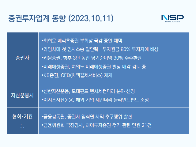 (서울=NSP통신) 송희진 기자 = 국회 정무위원회가 금융감독원 국정감사 증인으로 최희문 메리츠증권 부회장을 채택했다. 한편 라임사태 관련 첫 민사소송에서 원고 일부 승소 판결이 났다. 대신증권에서는 재판부의 의견을 존중한다는 입장이다.