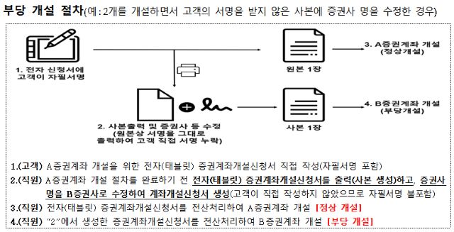 해당 직원들은 고객이 직접 전자 서명한 A증권사 증권계좌개설 신청서를 최종 처리 전 출력(사본)해 B증권사의 계좌개설신청서로 활용하는 등 비정상적인 방식으로 증권계좌를 추가 개설했다. 주요 시중은행에서는 이러한 방식의 증권계좌 추가 개설은 불가능하다.