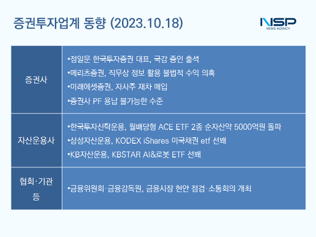 (서울=NSP통신) 송희진 기자 = 정일문 한국투자증권 대표가 국정감사 증인으로 출석하게 됐다. 업계에서는 한국투자증권이 벤처기업 기술 탈취 및 불공정 거래 의심을 받고 있기 때문이라는 이야기가 나온다. 한편 메리츠증권이 직무상 정보를 활용해 불법적 수익을 얻었다는 의혹을 받고 있다.