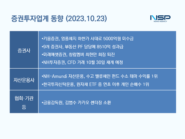 (서울=NSP통신) 송희진 기자 = 키움증권이 20일 장 종료 후 영풍제지 하한가 사태로 4943억원의 미수금이 발생했다고 공시했다. 이로 인해 키움증권의 주가는 20% 이상 하락했다. 한편 금융감독원이 김범수 카카오 대표를 소환했다. 금감원 특사경은 카카오에 대하여 SM 엔터의 주가 시세조종에 대한 수사를 진행 중에 있다.