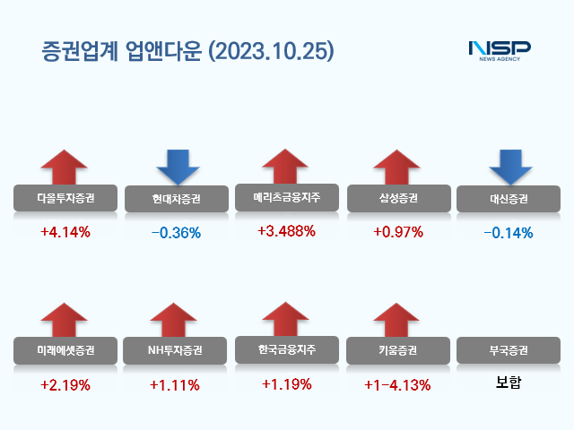 NH투자증권은 전거래일 대비 1.11%(110원) 상승해 10010원으로 장을 마쳤고 한국금융지주는 전거래일 대비 1.19%(600원) 올라 51200원으로 장을 마쳤다.