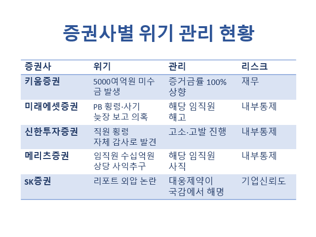 2023증권사 위기관리…신한 GOOD, 메리츠·SK·미래에셋 SOSO, 키움 BAD