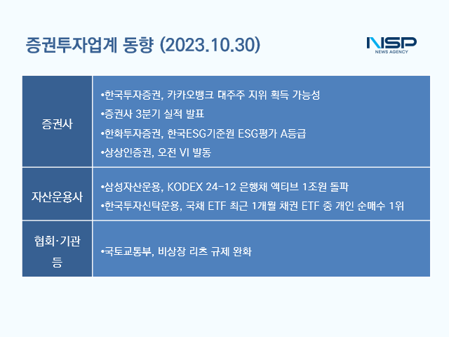 (서울=NSP통신) 송희진 기자 = 증권사들의 3분기 실적 발표가 이어지고 있다. 호실적을 기록한 증권사도 존재하는 반면 손실을 기록한 증권사도 있다. 한편 한국투자증권이 카카오뱅크 대주주 지위를 획득할 가능성이 높아지고 있다.