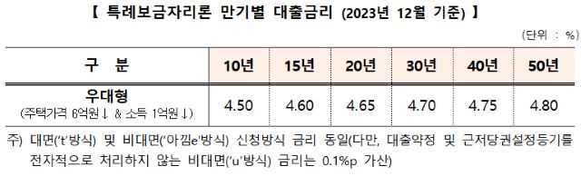 이에 우대형(주택가격 6억원&부부합산 연소득 1억원 이하 대상) 금리는 연 4.50%(10년)∼4.80%(50년)가 유지된다.