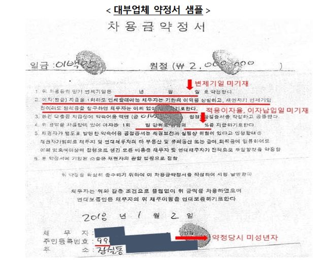 이와 함께 사회경험이 부족한 미성년자와 사회초년생을 대상으로 불공정한 대부계약을 통해 발생한 대부업체 채권 추심 사례도 확인됐다. 대부약정서에 이자납입일, 이자율 등 주요 약정사항이 기재되지 않았고 이자를 1회라도 연체한 즉시 기한이익이 상실되는 것으로 약정된 경우도 있었다.