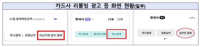 또 최근 카드사의 리볼빙 광고에는 ‘최소결제’·‘미납 걱정없이 결제’ 등 리볼빙이라는 단어 없이 다양한 용어가 사용되고 있다. 이로 인해 당월에 일부금액만 결제할 수 있는 ‘일시불 분할납부 서비스’ 등 타 서비스와 오인할 수 있고 리볼빙에 대한 거부감을 최소화해 리볼빙에 쉽게 가입을 유도할 우려가 있어 소비자의 각별한 주의가 요구된다.