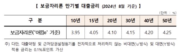 이에 ‘아낌e-보금자리’‘ 기준으로 연 3.95(10년)~4.25%(50년)가 적용되며 저소득청년, 신혼가구, 사회적배려층(장애인·한부모 가정 등) 및 전세사기피해자 등이 추가 우대금리(최대 1.0%p)를 적용받을 경우, 최저 연 2.95(10년)~3.25%(50년) 금리가 적용된다.