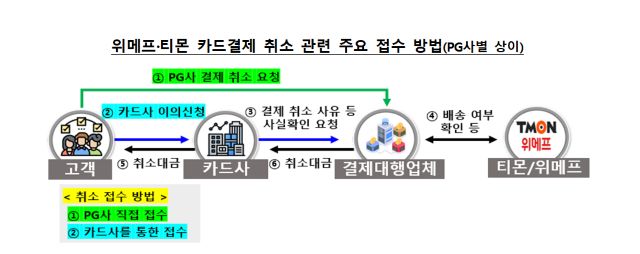 금감원은 “위메프·티몬 카드결제 취소와 관련하여 PG사의 카드결제 취소 접수 및 환불 현황을 모니터링하는 등 소비자가 환불받는데 불편이 없도록 노력할 예정”이라며 “이날 오후 4시부터 PG사의 카드결제 관련 애로사항 등을 청취하는 현장간담회를 개최해 필요한 사항에 대해서는 적극 지원할 예정”이라고 밝혔다.