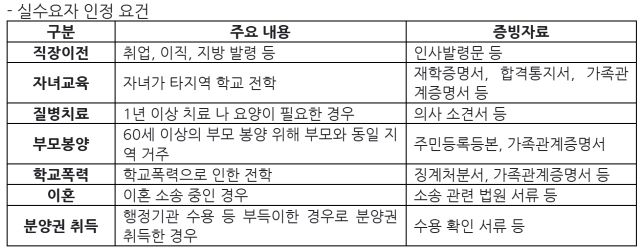 실수요자 인정 요건은 직장 이전, 자녀 교육, 질병 치료, 부모 봉양, 학교 폭력 등이 제시됐다. 이같은 요건을 인정받으려면 인사발령문, 재학증명서, 의사소견서 등 증빙자료를 제출해야 한다.