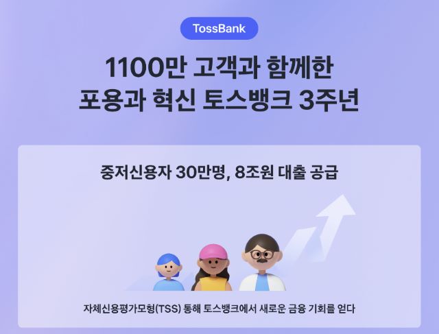 자체 신용평가시스템을 꾸준히 고도화 하며 토스뱅크는 인터넷은행 가운데 가장 높은 중저신용자 비중(약 34%)도 유지하고 있다. 창업 청년, 사회초년생, 소상공인, 금융이력부족자 등 건전한 중저신용자 30만명을 포용하며 8조원의 대출을 공급했다. 제2금융권에서 토스뱅크 대환대출 서비스를 이용한 고객들은 평균 4.1%p 이상 금리 인하 효과를 누리며 1인당 연 평균 41만원 가량의 이자 절감 효과를 누렸다.