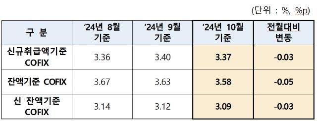 15일 전국은행연합회는 10월 기준 코픽스를 공시했다. 신규취급액기준 코픽스는 전월 대비 0.03%p 상승한 3.37%로 나타났다. 잔액기준 코픽스는 전월 대비 0.05%p 하락한 3.58%, 신잔액기준 코픽스는 전월 대비 0.03%p 하락한 3.09%다.