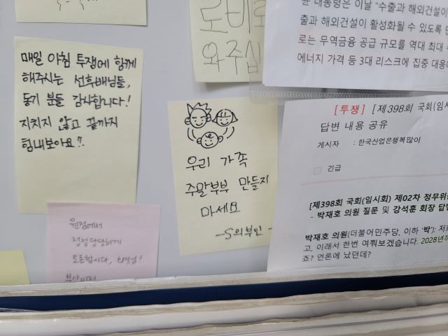 그 맞은 편 테이블 뒤엔 “우리가족 주말부부 만들지 마세요”라는 메시지가 담긴 포스트잇과 함께 부산이전 반대 시위에 동원됐던 보드가 겹겹이 세워져 있다. 2년 전만 해도 직원들이 아침마다 모여 부산이전 반대집회를 하고 부산이전 반대 투쟁 100일 기념떡을 돌리던 곳이다. 강석훈 산업은행 회장 취임 당시 은행 입구에 누워 강렬하게 저항하던 모습에서 이젠 몇몇 포스터만 붙어있는 대신 ‘꾹꾹곰’이 세워진 모습으로 바뀌었다.