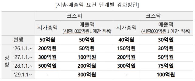 우선 시가총액, 매출액 요건의 기준을 상향 조정한다. 기존 요건이 과도하게 낮아 지난 10년간 상장폐지가 한 건도 발생하지 않는 등 실효성이 떨어진다는 지적이 있었다. 이에 따라 유가시장의 경우 시가총액 기준을 행 50억원에서 500억원으로, 매출액은 50억원에서 300억원으로 점진적으로 확대한다. 코스닥 시장 역시 시가총액 기준을 40억원에서 300억원으로, 매출액은 30억원에서 100억원으로 상향 조정한다.