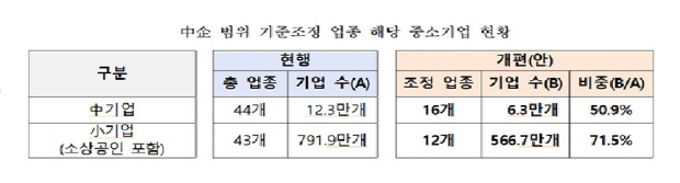 개편안에 따라 총 44개 중소기업 업종 중 16개, 43개 소기업 업종 중 12개의 매출액 범위를 상향한다. 이에 따라 전체 804만 중소기업 중 상향 업종에 속하는 약 573만개 기업(중기업 6만3000개, 소기업 566만7000개)은 안정적으로 세제감면, 공공조달, 정부 지원사업 등의 혜택을 받게 된다.