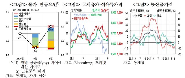 석유류가격은 지난해 2.9% 하락한 것의 기저효과와 6월중 국제유가의 일시 급등 등의 영향으로 상승 전환했다. 배럴당 두바이유는 지난달 중순 74.5달러까지 오른 뒤 27일 65.7달러로 하락했다.