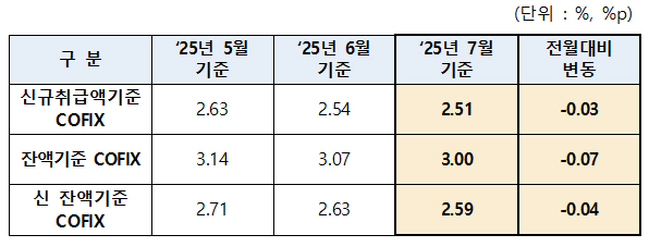 잔액기준 코픽스는 3.00%로 전월 대비 0.07%p 하락했다. 신잔액기준 코픽스는 전월대비 0.04% 내려 2.59%로 나타났다.