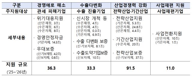 5대 금융지주는 내년까지 총 95조원을 지원하며 연초부터 8월말까지 약 45조원을 공급했다. 주요 상품으로는 ▲유망성장산업, 제조업 중소법인 대상 특별 금리 우대 ▲신기보, 지역보증 특별출연을 통한 대출 지원 ▲현대·기아차 협력사 대출지원(이상 KB금융) ▲미래혁신산업 ‘중소기업 혁신성장’ 지원대출 ▲국가첨단전략산업 특화산업단지 전용 신상품(이상 신한금융) ▲자동차 산업 수출경쟁력 강화 프로그램(하나금융) ▲수출기업 등 유동성 공급 및 금융비용 경감(우리금융) ▲소부장 등 중소·중견기업 P-CBO 발행확대 ▲관세피해 대기업 협력업체 금리우대(이상 농협금융) 등이 있다.