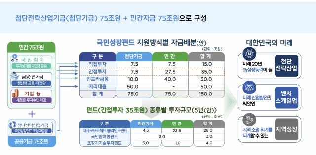 금융권에 따르면 이번 국민성장펀드는 첨단전략산업 기금과 민간자금 각각 75조원으로 구성되는 150조원 규모로 이뤄진다. 향후 5년간 ▲직접투자 15조원 ▲간접투자 35조원 ▲인프라금융 50조원 ▲저리대출 50조원으로 나눠 지원될 계획이다.