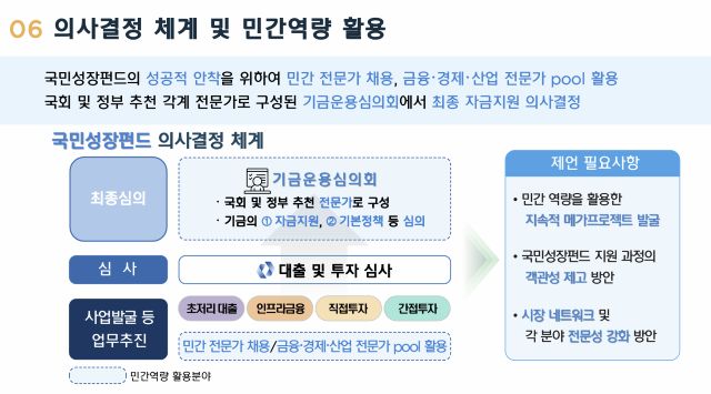 특히 이번 국민성장펀드의 최종 의사결정은 개정된 한국산업은행법상 국회 및 정부 부처에서 추천하는 9명의 민간 위원으로 구성된 기금 운용 심의회가 하게 된다. 정부, 금융, 경제, 산업 등 각 분야에서 전문가 풀을 구성해 시장과 소통하며 자문을 구할 예정이다.