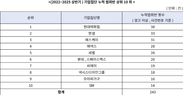 (서울=NSP통신) 옥한빈 기자 = 현대백화점이 최근 4년간(2022~2025 상반기) 기업집단 누적 ‘법 위반’ 상위 10위 중 1위로 밝혀졌다. 추경호 국민의힘 의원이 공정거래위원회(이하 공정위)로 받은 자료에 따르면 현대백화점은 경고 이상의 조치 38회를 기록했다.