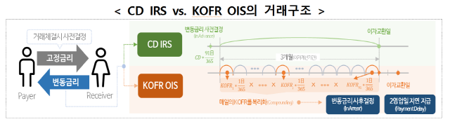그간 국내에서는 변동금리로 만기 91일의 양도성예금증서(CD) 수익률이 주로 사용됐으나 이번 KOFR OIS 청산제도는 기존 CD IRS와 동일한 거래구조를 가지고 KOFR(익일물)를 일단위 복리해 변동금리가 계산되는 점이 가장 큰 차이다.