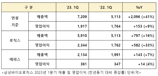 삼성바이오로직스의 1분기 별도기준 매출은 5910억원, 영업이익은 2344억원을 기록했다. 원료의약품(DS) 판매량 증가, 환율 상승영향 등으로 매출 및 영업이익은 전년 동기대비 각각 16%, 33% 증가했다. 특히 영업이익의 경우 1~3공장을 풀(Full) 가동하며 운영 효율을 극대화한 결과 큰 폭으로 늘었다.