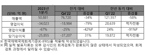 (서울=NSP통신) 이복현 기자 = SK하이닉스가 26일 실적발표회를 열고, 올해 1분기 매출 5조881억원, 영업손실 3조4023억원(영업손실률 67%), 순손실 2조5855억원(순손실률 51%)의 경영실적을 발표했다. (K-IFRS 기준)