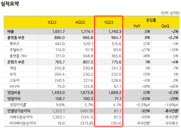 카카오의 2023년 1분기 플랫폼 부문 매출은 전 분기와 유사하고, 전년 동기 대비 9% 증가한 9647억 원으로 집계됐다.