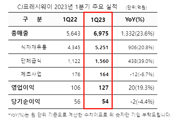(서울=NSP통신) 이복현 기자 = CJ프레시웨이가 연결 기준 올 1분기 매출이 6975억원, 영업이익이 127억원으로 집계됐다고 공시했다. 이는 전년 동기 대비 각각 23.6%, 19.3% 증가한 수치다.