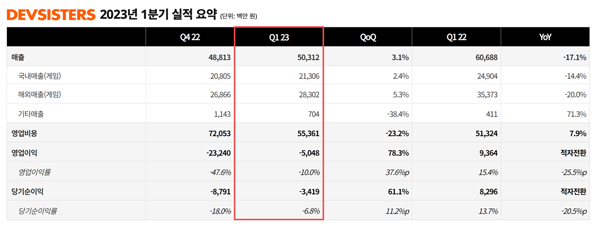 (서울=NSP통신) 이복현 기자 = 데브시스터즈(공동대표 이지훈, 김종흔)가 11일 K-IFRS 연결기준 2023년도 1분기 실적을 발표했다.