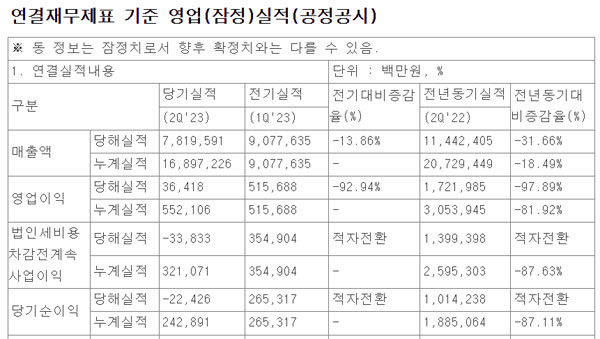 이는 전년동기 대비 매출은 31.66% 하락했고 영업이익은 97.89% 하락했다. 환율 상승에 따른 환차손의 영향으로 순이익은 적자로 전환했다.