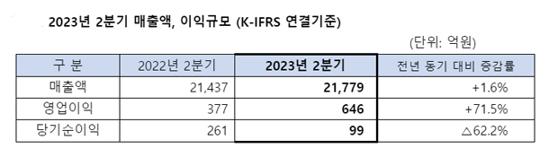 전년 동기 대비 매출은 1.6%, 영업이익은 71.5% 증가한 수치다.