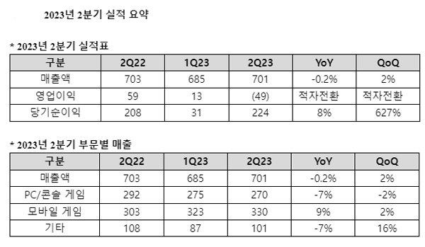 (서울=NSP통신) 이복현 기자 = 네오위즈(공동대표 김승철, 배태근)가 2023년 2분기 실적을 발표했다.