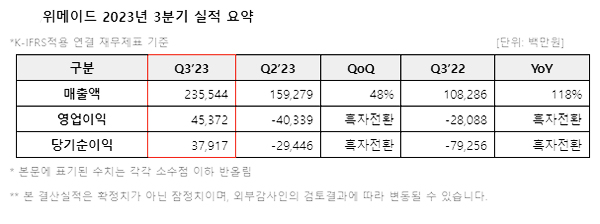 한편 위메이드맥스의 연결기준 3분기 매출액은 실크로드 온라인 등의 로열티 매출증가로 약 184억원, 영업이익은 약 12억원, 당기순이익은 약 14억원을 달성했다.
