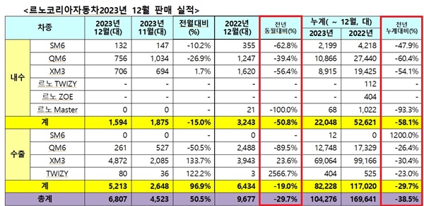 또 12월 판매 실적도 내수 1594대, 수출 5213대로 총 6807대 판매 실적을 달성했고 전년 동월 대비 27.9% 감소했다.