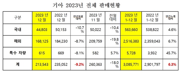 기아는 2023년 한 해 동안 국내 56만 3660대, 해외 251만 6383대, 특수 5728대 등 2022년 대비 6.3% 증가한 308만 5771대를 판매했다(도매 판매 기준)
