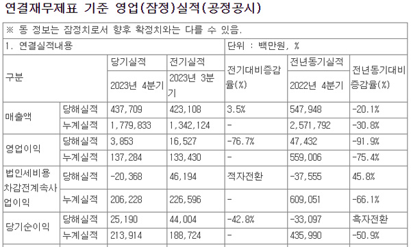 이로써 23년 연간 매출은 1조7798억원, 영업이익은 1373억원, 당기순이익은 2139억원으로 집계됐다.