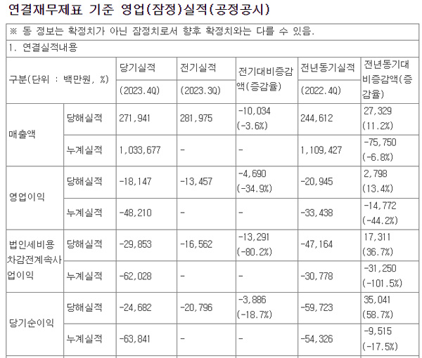 (서울=NSP통신) 이복현 기자 = 글로벌 광반도체 전문 기업 서울반도체(대표 이정훈, 홍명기)가 2023년 4분기 잠정 연결기준으로 매출 2719억원, 영업이익은 181억원의 손실을 기록했다.