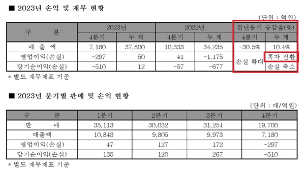 2023년 판매는 내수 6만 3345대, 수출 5만2754대 등 총 11만 6099대로 2022년 대비 1.9% 증가했으며 매출은 제품믹스 등의 개선 효과로 2022년 대비 10.4% 증가한 3조 7800억 원을 기록하며 창사 이래 연간 최대 매출을 달성했다.