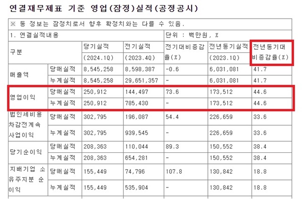 매출은 8조 5453억 원으로 전년 동기 대비 41.7% 증가해 연간 매출 목표 29조 7000억 원의 28.8%를 달성했으며 영업이익은 2509억 원으로 전년 동기 대비 44.6%의 증가세를 보였다.