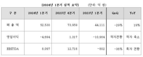 영업손실은 4694억원, 당기순손실은 7613억원, EBITDA(상각 전 영업이익)는 8097억원(이익률 15.4%)을 기록했다.