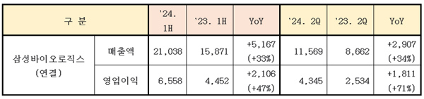 삼바의 상반기 별도기준 매출은 1조4797억원, 영업이익은 5620억원으로 각각 전년동기 대비 2515억원, 735억원 증가했다.