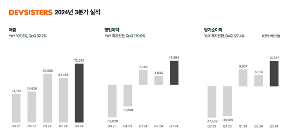데브시스터즈는 2024년 3분기 매출 720억원, 영업이익 134억원, 당기순이익 143억원을 기록했다.